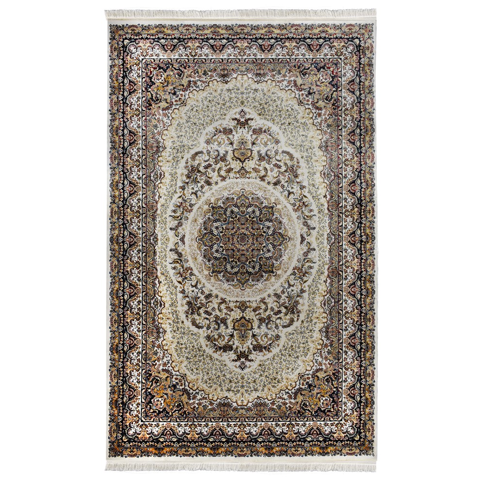 Tapet Persian me përbërje e gjitha prej poliestër. Baza krem me ngjyra të ndryshme. Tapeti është i punuar deri në detaje. Thekët prej pambuku dhe dendësia shumë e madhje prej 1 miljon e 200 mijë nyje për metër katror i japin këtij tapeti cilësi dhe jetëgjatësi. Falë dendësisë tapeti është i sigurt nga papastërtitë pasi në qoftë se pastrohet menjëherë ato nuk arrijnë të depërtojnë në bazën e tapetit. Gjatësia e fijes 6mm. I rekomanduar të lahet në mënyrë profesionale.