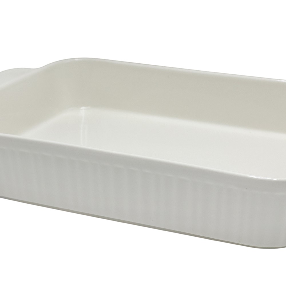 Gatuani dhe shërbeni me stil me këtë tavë furre prej qeramike të bardhë. Me dimensione 36.5x22x6 cm, ajo ofron hapësirë të bollshme për pjekje të barabartë dhe shërbim të lehtë të ushqimeve të ndryshme. Materiali i qeramikës siguron ruajtje të mirë të nxehtësisë dhe përdorim të qëndrueshëm, ndërsa dizajni i thjeshtë dhe elegant e bën të përshtatshme për çdo tryezë dhe ambient kuzhine. I lehtë për pastrim dhe i qëndrueshëm, ky aksesor është i domosdoshëm për çdo amator ose profesionist të gatimit.