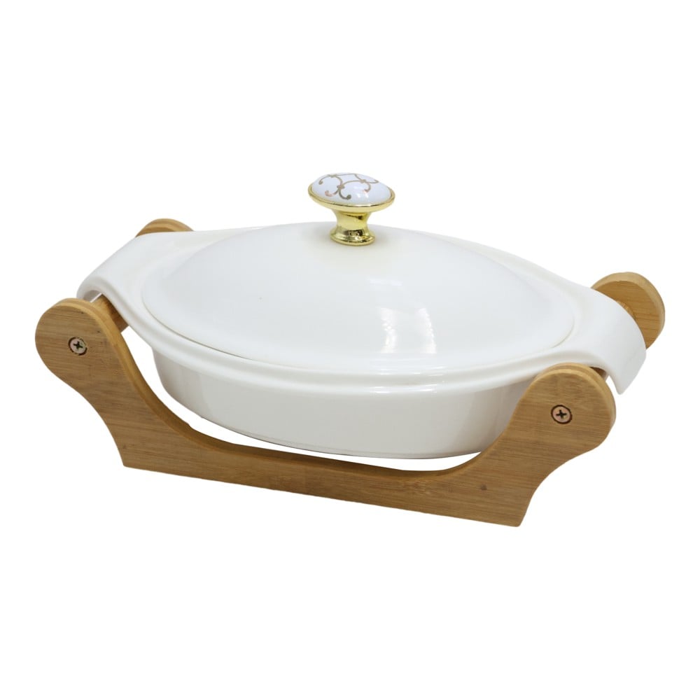 Tavë me stendë mbajtëse, qeramikë/dru, e bardhë, 8x26xH16 cm
