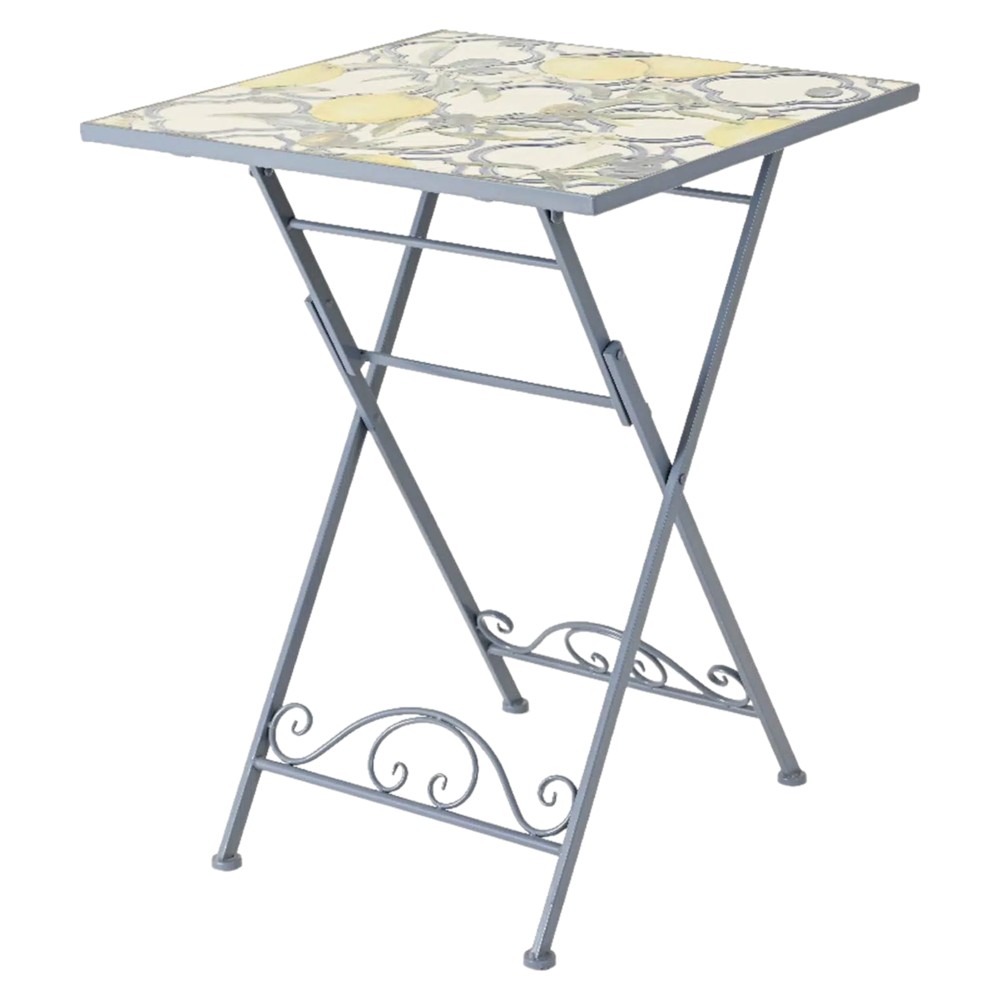 Kjo tavolinë është prodhuar me një kombinim të metalit dhe pllakës, duke e bërë atë të qëndrueshme dhe të përshtatshme për përdorim të jashtëm. Nuanca blu me ngjyra dhe dekoret e limonit i jepin një pamje tërheqëse dhe pranverore, duke e bërë atë një përshtatje të shkëlqyer për shumë stile dhe dekore të ndryshme.