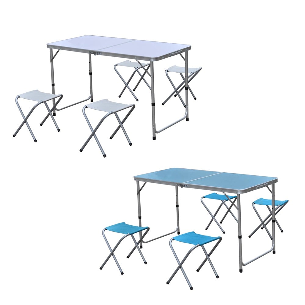 Tavolinë e palosshme me 4 stola, prej materiali alumin I bazamentit, në material MDF i shtresës, dhe në material poliestër të ulëses së stolit. Materiali alumin i lehtë i saj e bën atë të lehtë për tu marrë me vete, kapaciteti mbajtës i saj është 30 kg Tavolina e kampingut përbëhet nga tavolina e paloshme me përmasë të hapur 120 cm gjatësi, lartësi 70 cm dhe gjerësi 62 cm, Karrigia në përmasë 30 cm gjatësi, 36 cm lartësi dhe 24 cm gjerësi. Ngjyra: e bardhë dhe gri. E përshtatshme për tu përdorur në kuzhinë, në oborr ose gjatë piknikut apo kampingut, e përshtatshme si një tryezë anësore në një tarracë. Në dy ngjyra gri dhe jeshile, ngjyrat nuk zgjidhen.