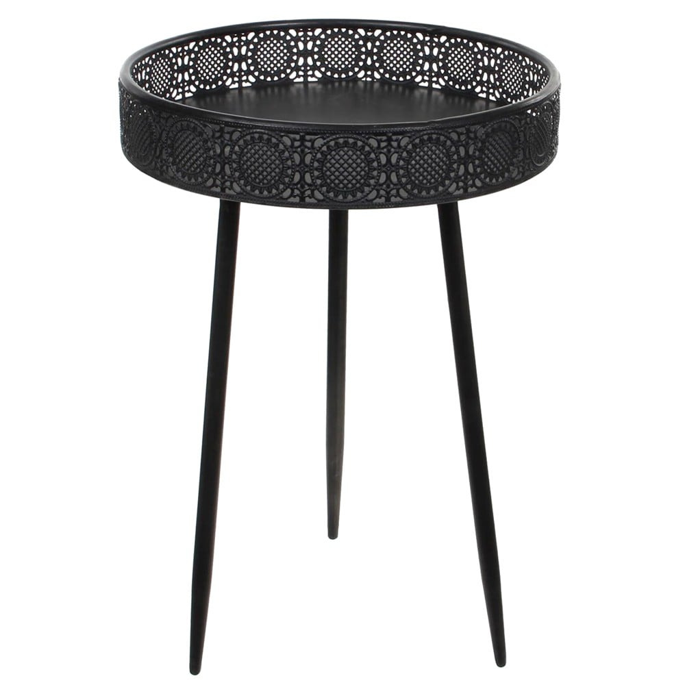 Tavolinë mesi, e rrumbullakët në ngjyrë të zezë me 3 këmbë elegante. Pjesa anësore është me model luleh nga jashtë. Kjo tavolinë është e stilit antik. Merrni kohë për të bërë një pushim rreth kësaj tryeze të stilit të jashtëzakonshëm, e përsosur për të ndarë një kohë të mirë me miqtë ose familjen tuaj.