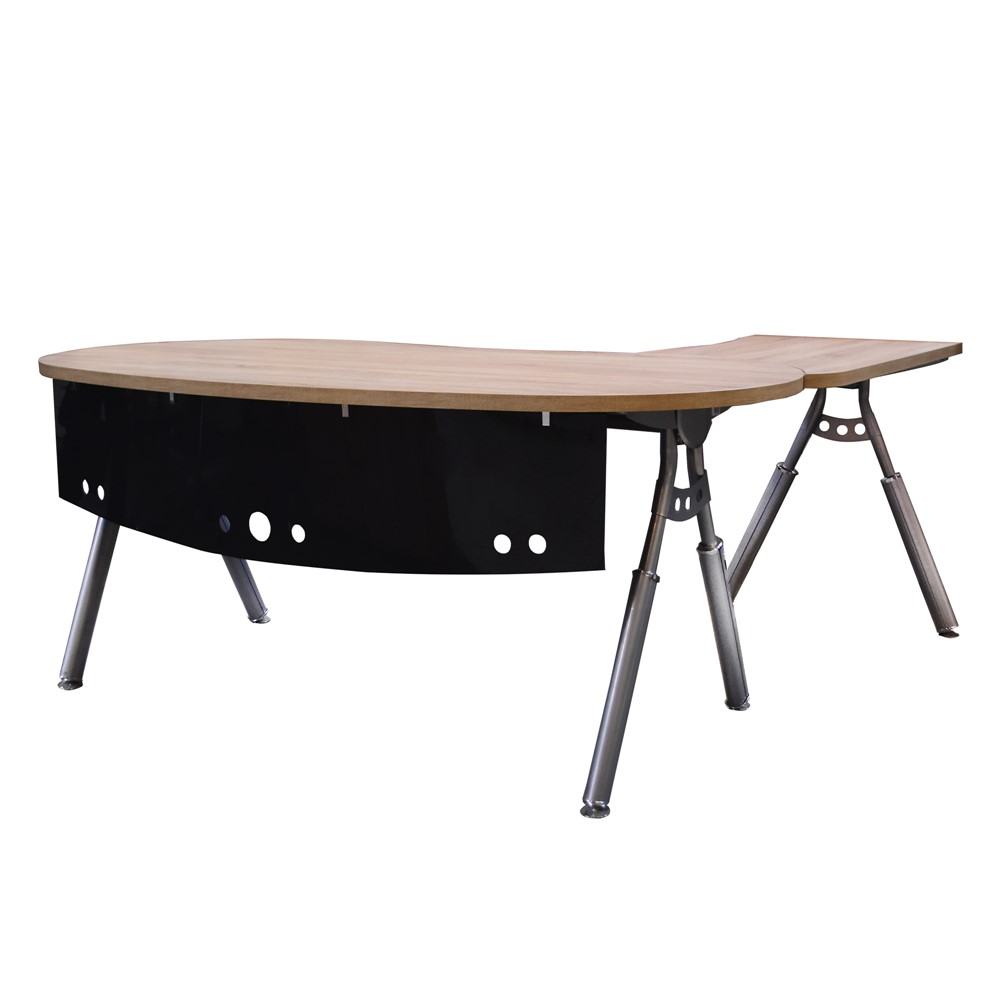 Tavolinë zyre, me kënd majtas, strukturë metalike (argjendi), syprinë melamine, lisi, 190x160xH75 cm