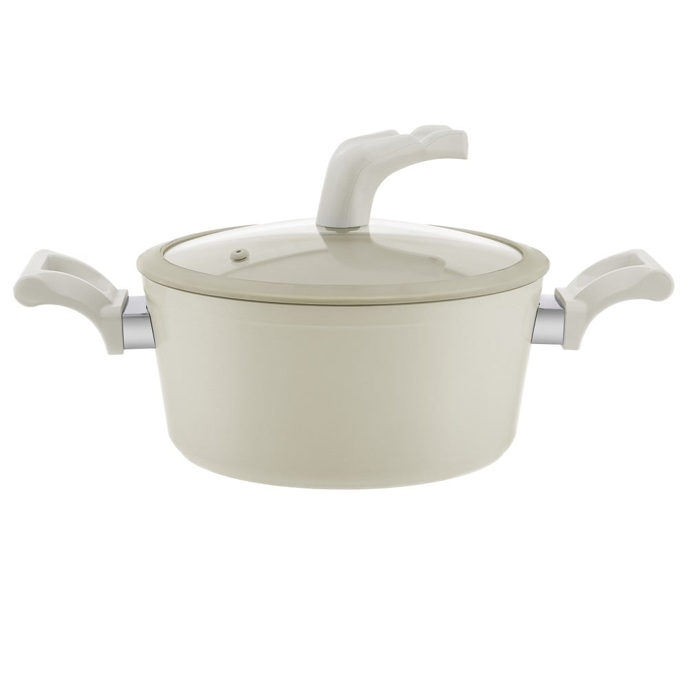 Zbuloni përkryerjen në gatim me tenxheren Vega, një zgjedhje ideale për kuzhinën tuaj moderne. Kjo tenxhere elegante dhe funksionale transformon gatimin e përditshëm në një eksperiencë të këndshme dhe pa sforcim. Me një kapacitet prej 5.5 litrash dhe dimensione të balancuara (diametër 26 cm x lartësi 12 cm), tenxherja Vega është perfekte për një gamë të gjerë gatimesh, duke filluar nga zierja e supave dhe salcave deri te përgatitja e makaronave apo pjatave me mish. Ngjyra e saj e kremtë dhe dizajni i pastër i shtojnë një prekje elegance dhe moderniteti çdo kuzhine. Në thelb të kësaj tenxhereje qëndron shtresa inovative qeramike kundër ngjitjes. Kjo sipërfaqe e jashtëzakonshme garanton që ushqimi juaj të mos ngjitet, duke bërë gatimin dhe pastrimin tepër të lehtë. Ajo është gjithashtu e sigurt dhe pa kimikate të dëmshme, duke ju lejuar të gatuani më shëndetshëm me më pak yndyrë. E ndërtuar nga alumini rezistent, tenxherja Vega siguron shpërndarje uniforme dhe të shpejtë të nxehtësisë në të gjithë sipërfaqen, duke parandaluar pikat e nxehta dhe duke siguruar gatime të barabarta çdo herë. Kapak qelqi transparent është një veçori praktike, duke ju mundësuar të monitoroni ushqimin pa hequr kapakun, gjë që ruan nxehtësinë dhe lagështinë. Për më tepër, baza e saj e përshtatshme për induksion e bën atë të pajtueshme me të gjitha llojet e pllakave të gatimit, duke rritur efikasitetin energjetik dhe shpejtësinë e ngrohjes.