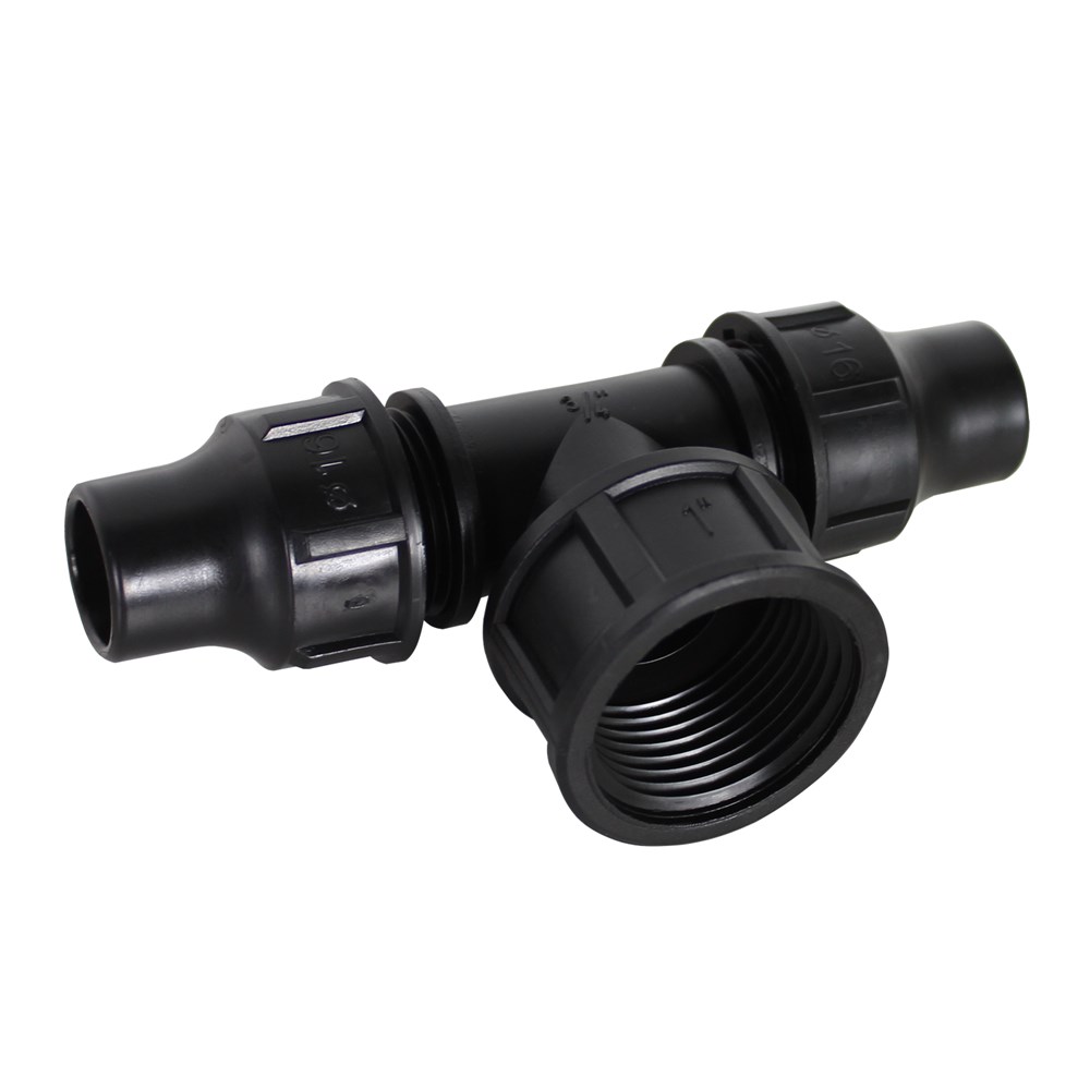 Ti me rakord 16x1"x16 mm femer prej PE me kënd 90°. Përdoret gjërësisht sot në Europe për instalimet këndore të linjave ujësjellëse, vaditjet në bujqësi etj. Kjo ti bën te mundur degezimin e rrjetit në kënd 90°. Kjo ti bashkon tubin LDPE Ø 16 me rakorderi te tjera me anë të filetove, për bashkimin me fileto rekomandojmë të përdoret teflon ndërsa tubi bashkohet me ti-në në mënyrë mekanike me rakord. E prodhuar me standarte Europiane, rezistent ndaj lëndëve gërryese dhe projektuar për t'i bërë ballë presionit deri në 6 Bar.