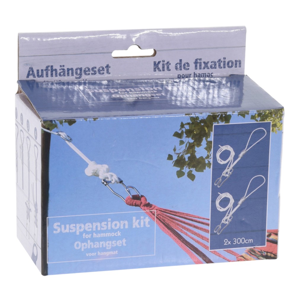Seti ideal per montimin dhe pozicionimin e shtrateve lekundes "Hammock". Seti perbehet nga 2 litare 300 cm, te cilet mund te lidhen rreth pemeve apo strukturave te tjera vertikale dhe nga 2 ganxha, te cilat mundesojne kapjen e litarit me lekundesen. I gjith sistemi suporton peshe mbajtese deri ne 120 kg.