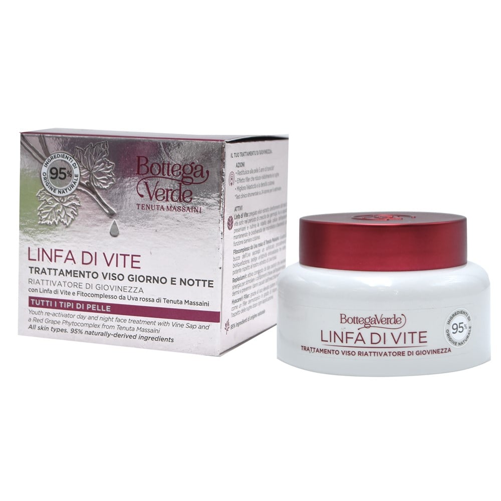 Krem për trajtimin e lëkurës gjatë ditës dhe natës, i cili ndihmon në detoksifikimin e lëkurës dhe korrigjimin e rrudhave, rigjeneron lëkurën, parandalon plakjen e parakohshme dhe ndihmon në riaktivizimin qelizor, duke nxitur sintezën e nevojshme për energji. Përmbajtja e pasur me ekstrakt të rrushit të kuq Massaini ndihmon në aktivizimin e proceseve natyrale detoksifikuese dhe parandalon krijimin e toksinave të reja. Ky produkt është i përshtatshëm për përdorim në të gjithë llojet e lëkurës.