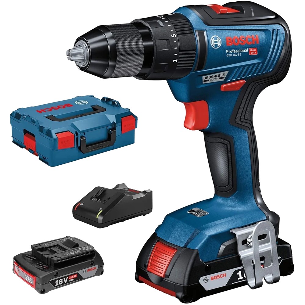 Trapan profesional me bateri, Bosch, GSB 18V-55-LI, pa karboncina, 18 V, 2 x 2.0 Ah, 55 Nm, 13 mm mandrino, 35 mm dru, 13 mm celik, 10 mm vida, 13 mm beton