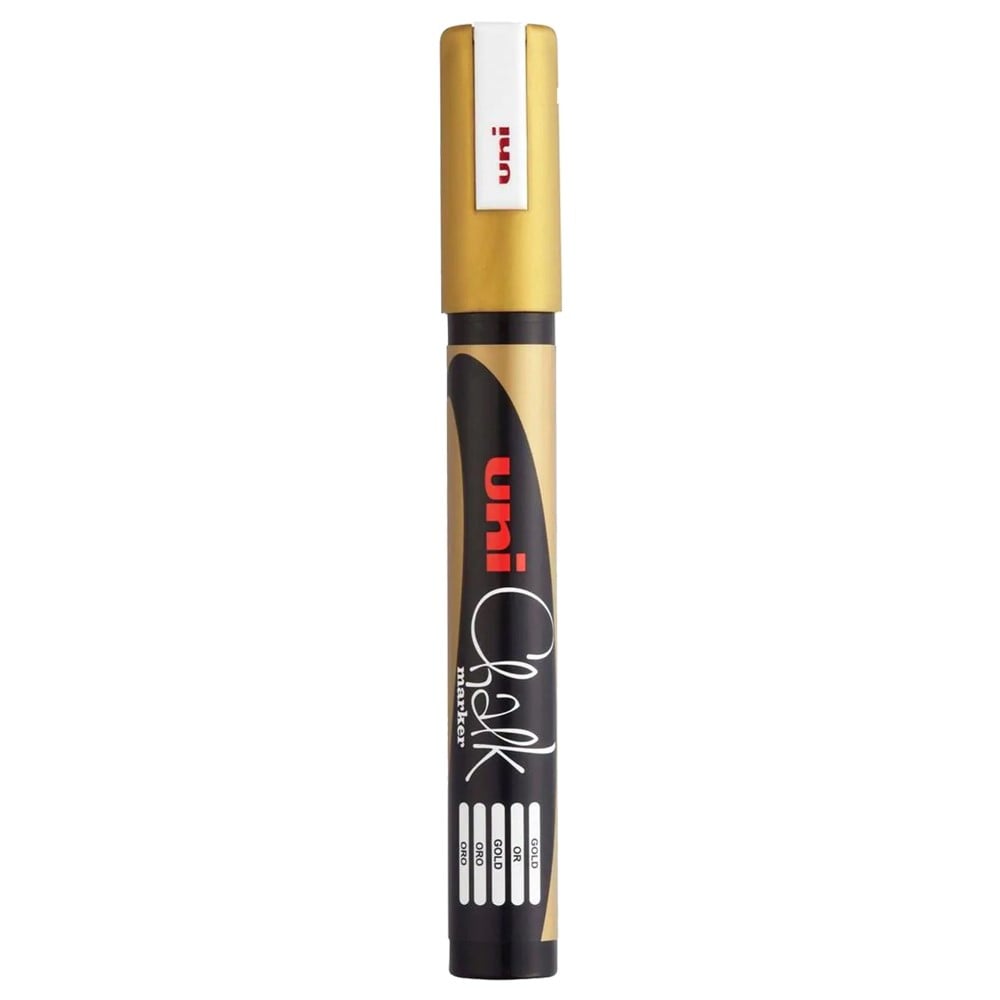 Shkumës me ngjyrë gold I lëngshëm Uni Marker. Shkruan në çdo sipërfaqe jo poroze (tabela e zezë, qelqi, plastika, metali, druri, etj.) Eshtë rezistent ndaj lagështirës dhe mund të pastrohet lehtë me një letër të lagur.