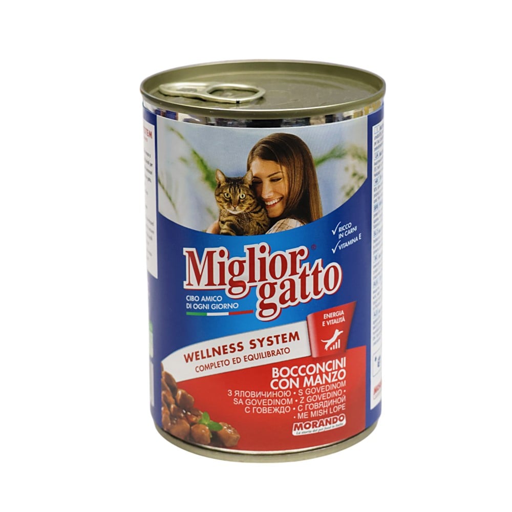 Ushqim për mace i konservuar 405gr. CHUKNS MIGLIORGATTO me mish lope. Mish dhe nenproduktet e mishit (viçi 5%) Drithëra