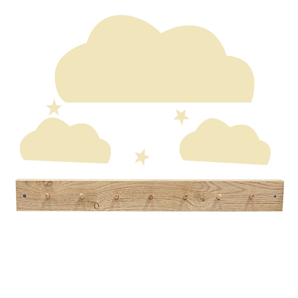 Varese rrobash "Cloudy" është një zgjidhje e shkëlqyeshme për organizimin e rrobave në mënyrë të përshtatshme dhe tërheqëse. Me një dizajn druri dhe ngjyrë natyrale, ajo shkon mirë me shumicën e dekorimeve të shtëpisë. Format e reve dhe yjeve jane stikera te cilat ngjiten ne mur, ndersa varsja prej material druri.