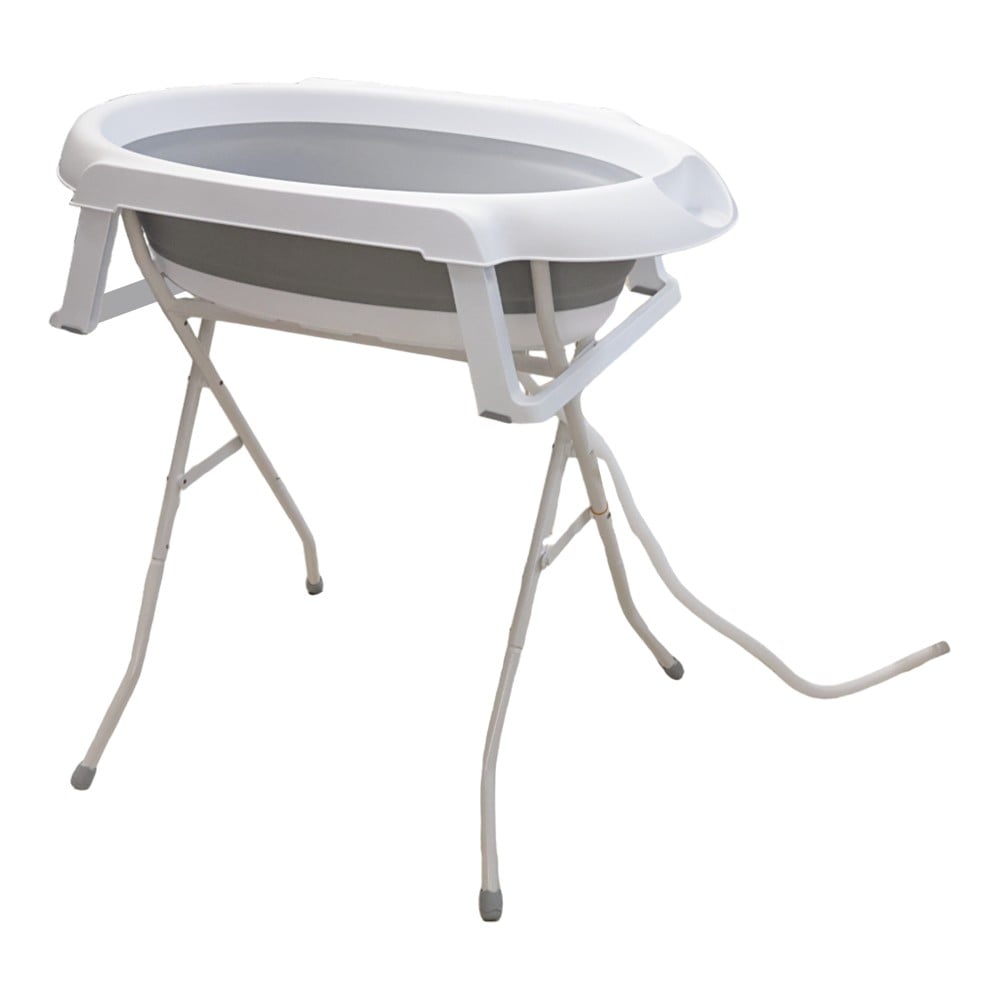 Vaska me këmbë për fëmijë, e prodhuar nga silikon dhe alumini, ka përmasa 83x23.5x47 cm. Me një dizajn modern në ngjyrat gri dhe bardhë, kjo vaskë ofron komoditet dhe siguri për përkujdesjen e fëmijëve. E lehtë për tu pastruar dhe e qëndrueshme, ajo është perfekte për përdorim në shtëpi, duke ofruar një eksperiencë të këndshme për fëmijët gjatë kohës së banjës.