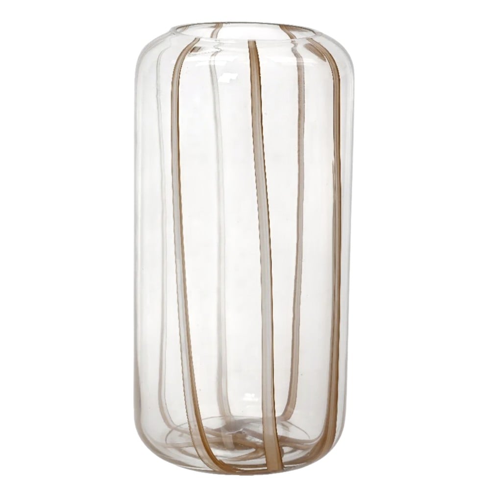 Vazo dekorative prej qelqi transparent, me linja të pastra dhe dizajn minimalist. E përshtatshme për çdo stil arredimi, duke shtuar një prekje delikate në ambient.