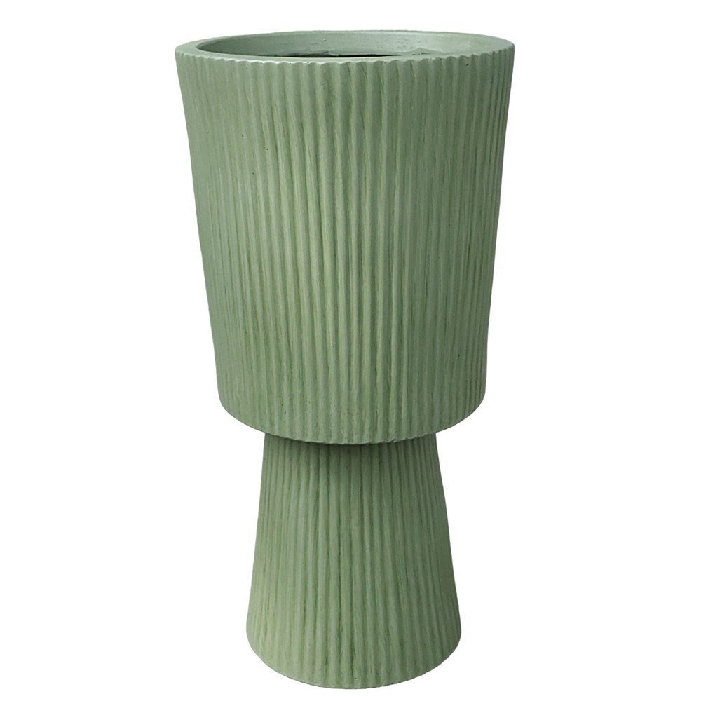 Kjo vazo lulesh është një pjesë e jashtëzakonshme e dekorit, e dizajnuar për të sjellë një atmosferë të sofistikuar dhe unike në ambientet e ndryshme shtëpiake ose biznesi. E krijuar me kujdes nga fibra xhami/argjilë, vazo është me ngjyrën jeshile duke i dhënë një ndjesi të butë dhe të rafinuar. Vazoja do të shtojë një notë të veçantë estetike dhe do të bëjë që lulet tuaja të shkëlqejnë edhe më shumë në ambientin tuaj.