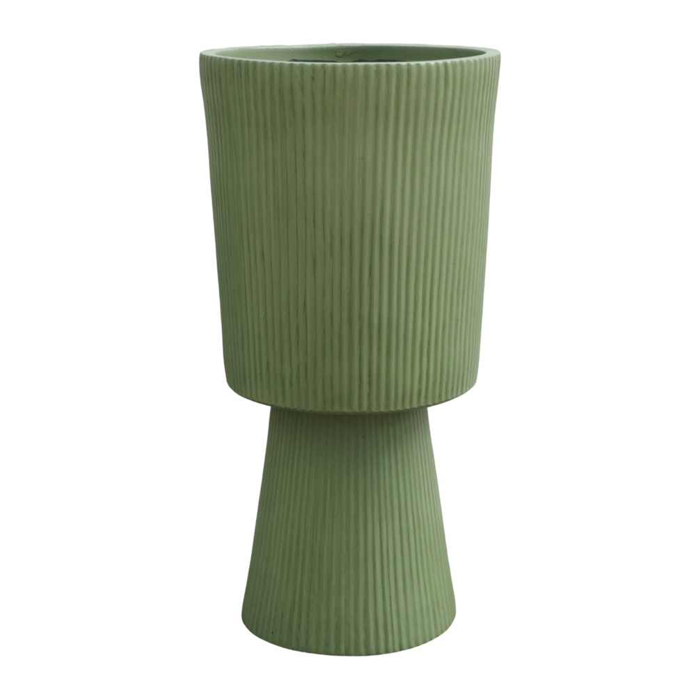 Kjo vazo lulesh është një pjesë e jashtëzakonshme e dekorit, e dizajnuar për të sjellë një atmosferë të sofistikuar dhe unike në ambientet e ndryshme shtëpiake ose biznesi. E krijuar me kujdes nga fibra xhami/argjilë, vazo është me ngjyrën jeshile duke i dhënë një ndjesi të butë dhe të rafinuar. Vazoja do të shtojë një notë të veçantë estetike dhe do të bëjë që lulet tuaja të shkëlqejnë edhe më shumë në ambientin tuaj.