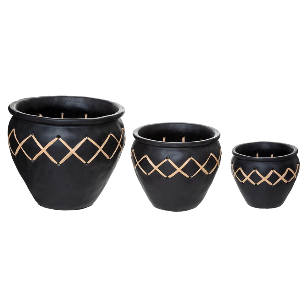 Vazo lulesh, raphia, çimento, e zezë, Ø17xH14.5 cm; Ø22.5 xH19 cm; Ø29 xH25 cm