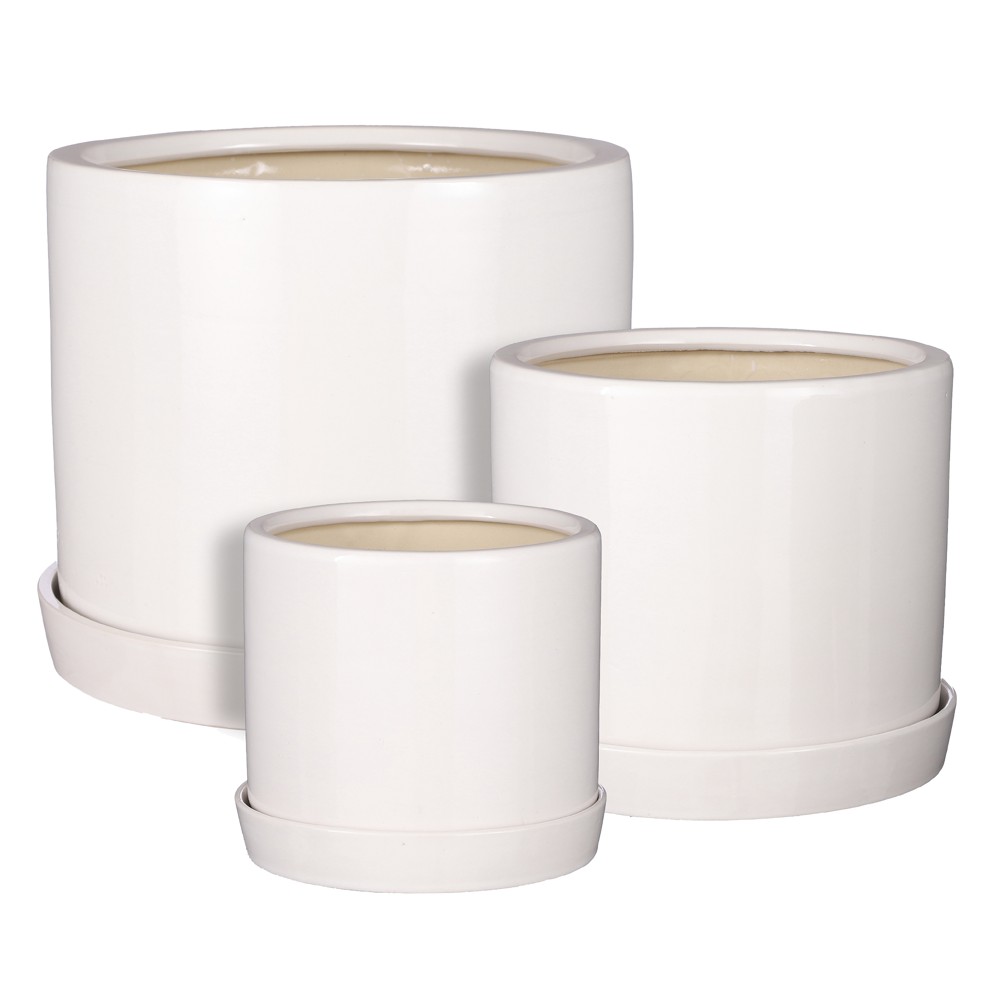 Vazo lulesh, set 3 copë, pjatë e përfshirë, Milan, qeramike, e bardhë, Ø19 xH17 cm; Ø24 xH21 cm; Ø31.5 xH26 cm