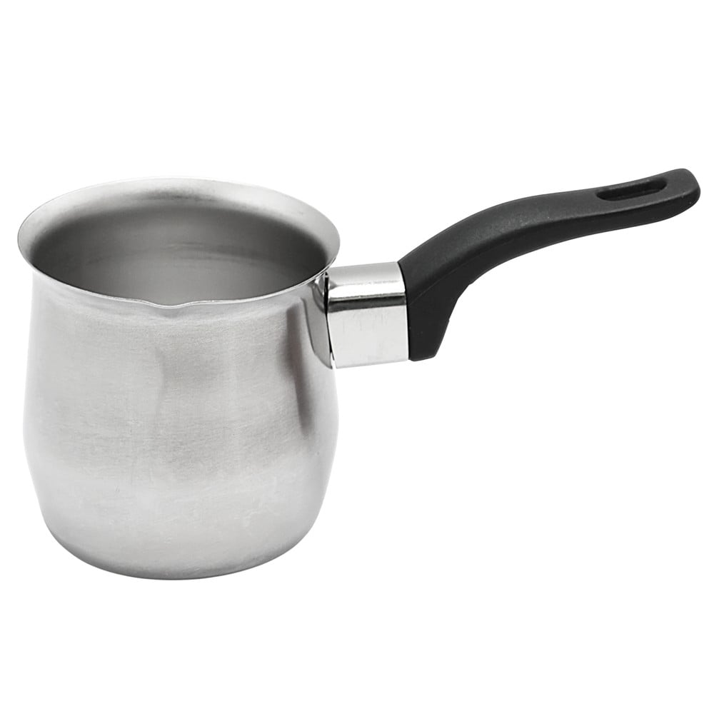 Xhezve e kombinuar inoks dhe dorezën plastikë, me ngjyra argjendi dhe e zezë. Me përmasa Dia. 6.5 × H 15 cm, është e përshtatshme për përgatitjen e kafesë turke ose ekspres në mënyrë të shpejtë dhe praktike. Dizajni modern e bën të lehtë për përdorim dhe pastrim.